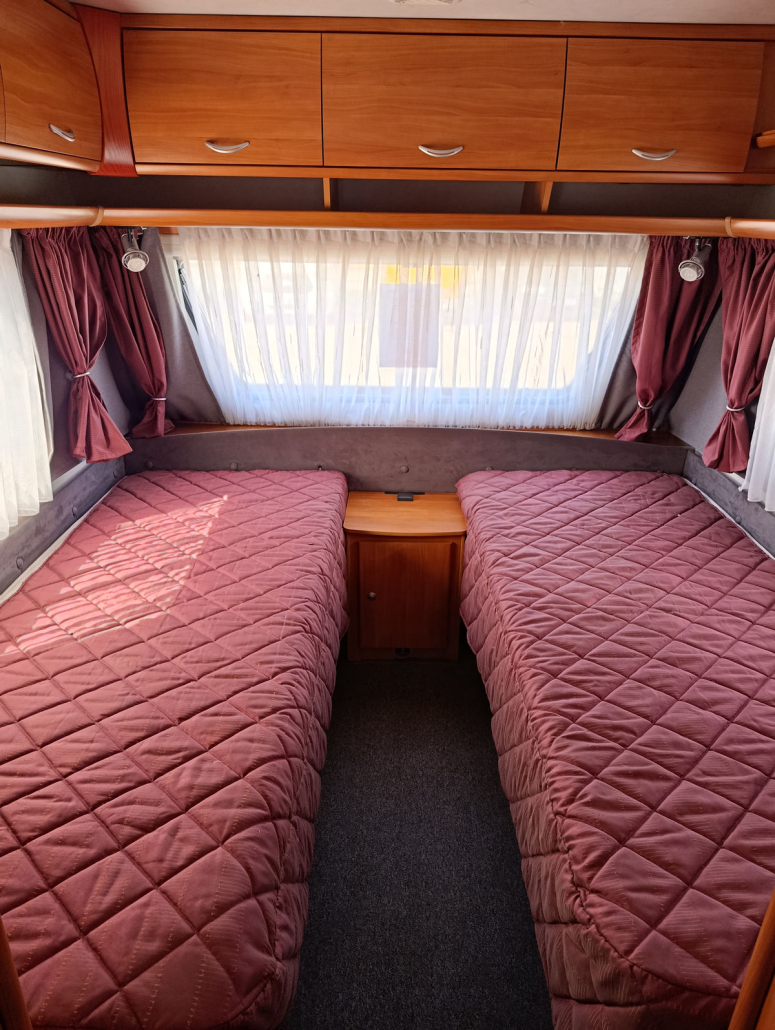 Felszereltsége: Zárt elősátor, 2×3 m-es kiegészítő sátor, elősátorszőnyeg, Thule omnisztor, AL-KO alváz, stabilizátoros vonófej, vonófejzár, ATC menetstabilizátor, Prémium orrkerék, elektromos letalpaló lábak, alufelni, Truma Aventa tetőklíma, Truma fűtés + UltraHeat elektromos kieg. fűtés, 3 üzemű Dometic hűtőszekrény + hűtőventillátor, 3 rózsás gáztűzhely + mosogató + szagelszívó, zuhanyzós melegvizes fürdőszoba, beépített WC, külső zuhanycsatlakozó, televízió, HIFI rendszer, 220V+ USB csatlakozó, 1 db 11 kg gázpalack, térelválasztó, gardóbszekrény, beépített széf, panoráma tetőablak, Thule biztonsági zár+ kapaszkodó, szúnyogháló + sötétítő az ablakokon, szúnyogháló a bejárati ajtón, Fiamma 2-es kerékpártartó, szervízajtó, pótkerék, tekerő, fellépő, téli takaróponyva. A két külön ágyból kényelmes franciaágy alakítható ki!
