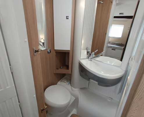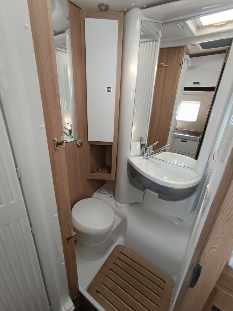 Felszereltsége: Thule napárnyékoló, Dometic tetőklíma, Truma Combi fűtés + melegvízrendszer, 3 rózsás gáztűzhely + mosogató, 3 üzemű Thetford hűtőszekrény, mosdó + zuhanyfülke, beépített Thetford WC, víztartály, szennyvíztartály, 1 db 11 kg-os gázpalack, sötétítő + szúnyogháló az ablakokon, szúnyoghálós bejárati ajtó, XZENT 2 dines multimédiás rendszer, Teleco TV + antenna, panoráma tetőablak, motoros mozgatású felső franciaágy